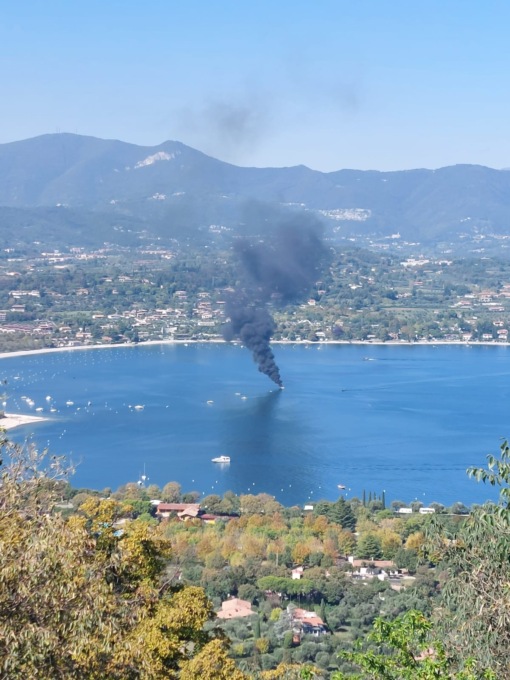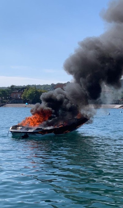 Barca in fiamme in mezzo al lago a Manerba