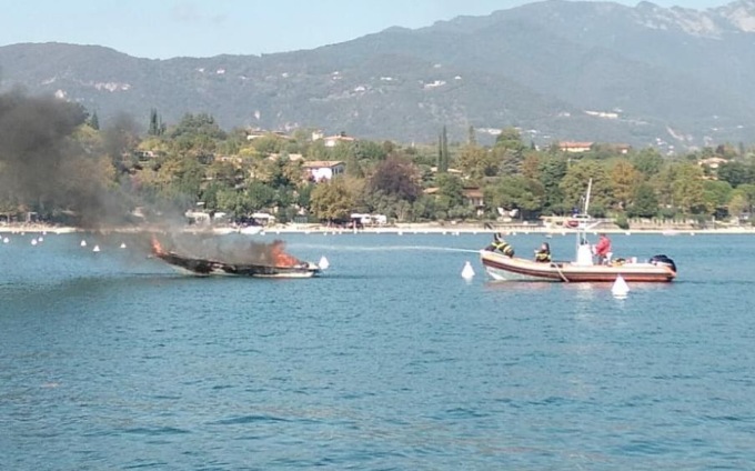 L’allarme è scattato intorno alle 13 di domenica, quando numerose persone, che a quellora si trovavano sulla costa del comune di San Felice e di Manerba, hanno notato fumo e fiamme levarsi da un motoscafo che era a circa 200 metri dalla costa ed hanno chiamato la Sala Operativa della Guardia Costiera di Salò che oltre ad inviare immediatamente il GC A58, ha richiesto alla S.O. dei VVF di Brescia lintervento della loro unità di stanza a Salò.Giunti dopo pochi minuti i guardiacoste hanno verificato che i due diportisti, che si trovavano sul motoscafo, ove era scoppiato lincendio, erano stati già trasbordati da altro natante, che era nei pressi del motoscafo andato in fiamme, trasferendoli presso un vicino pontile di San Felice.