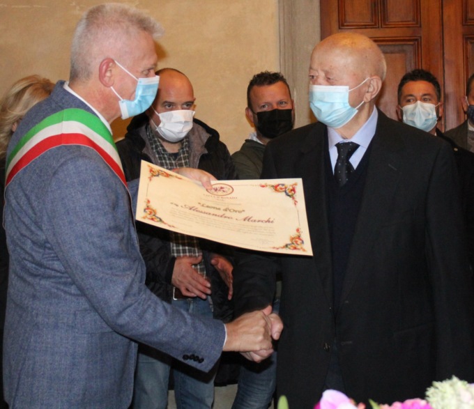 Alessandro Marchi è nato a Rovato il 20 febbraio 1932. Da 64 anni è sposato con la moglie Orsolina. Ha svolto l’attività di commerciante, prima come fruttivendolo e poi come fiorista, fino al 2001. La sua grande passione per la musica lo ha condotto nel 1943, a soli 11 anni, a intraprendere gli studi musicali. Dagli anni Sessanta Marchi ha affiancato all’attività di strumentista (per quasi tutta la sua carriera ha suonato il trombone) quella di consigliere della banda. Il 14 dicembre 1969 ha ricevuto la medaglia d’oro per la sua lunga militanza nel complesso. In occasione del Concerto di Natale del 21 dicembre 2014 è stato insignito della carica di presidente onorario del corpo bandistico. Nel 2016, durante le festività patronali, ha ricevuto il diploma di benemerenza al merito.