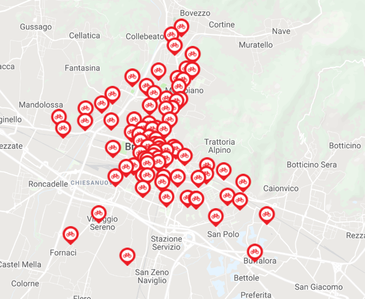 Ecco la mappa dei nuovi punti bici: a Fornaci, all’altezza dell’ingresso nord del quartiere, a Folzano, all’altezza della fermata dell’autobus vicino alla nuova piazza, a Buffalora, nel piazzale della chiesa, a Fiumicello, nei giardini di Via Franzinetti/Mercantini e a Primo Maggio, all’altezza dell’area verde presso la chiesa. Altre due nuove postazioni si trovano invece in via Scuole, all’altezza della caserma dei Vigili del Fuoco, e in via Sostegno, in corrispondenza del lato sud della Stazione FS.