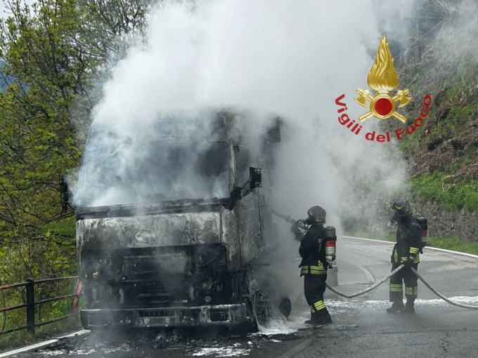 Camion a fuoco sulla ss294 nella Bergamasca, l’intervento dei Vigili del Fuoco di Darfo e Breno.