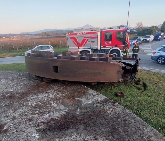 La chiamata al 112 è scattata intorno alle 5.30 di lunedì mattina. Allertati Vigili del fuoco, Polizia stradale, un’auto medica e l’ambulanza dei Volontari di Bornato. Le condizioni del conducente del Tir, un 61enne, non sarebbero gravi (è stato trasportato in codice giallo agli Spedali Civili di Brescia). Decisamente è andata alla celebre scultura che impreziosiva il rondò. La Grande bocca, una ruota di 5,20 metri di diametro, è stata travolta e divelta. Realizzata in acciaio Cort-en e assemblata in officina con le saldature e i segni del flessibile lasciati bene in vista, enfatizzando il gioco della divisione degli spazi tra solido e vuoto, l’opera è stata concepita in funzione dell’ambiente circostante. Trovandosi a una manciata di metri dal casello autostradale A4 di Rovato, nel tempo è diventata un simbolo per la popolazione e i turisti diretti in Franciacorta.