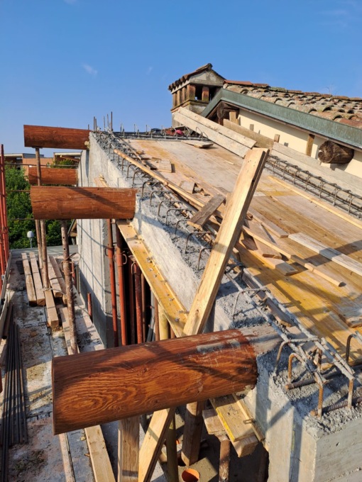 La parte visibile della copertura dell’ampliamento è stata realizzata con travi a sezione circolare e con travetti in legno simili a quelli già presenti in altre parti dello stabile. Il manto di copertura è in coppi di laterizio mentre le lattonerie per le scossaline, per i canali di gronda e per i canali pluviali sono in lamiera di rame. Il corpo di fabbrica aggiunto rimane separato 12 centimetri dall’edificio storico, creando un giunto sismico strutturale nel rispetto della normativa antisismica e, per rendere uniforme la lettura d’insieme, la superficie esterna è stata resa il più possibile simile alla parte restante dell’edificio, seguendo le indicazioni della Soprintendenza Archeologia, Belle Arti e Paesaggio per le Province di Bergamo e Brescia.
