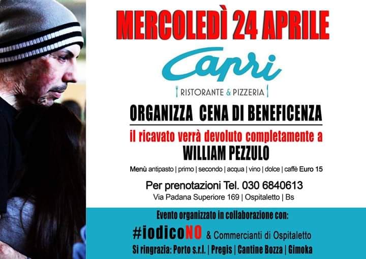 Ultime ore per le prenotazioni alla cena di beneficenza in favore del travagliatese William Pezzulo, che si terrà questa sera al ristorante pizzeria Capri (via Padana Superiore 169, Ospitaletto) a partire dalle 20. Cena a menù fisso a 15 euro, il cui intero ricavato sarà devoluto a William per sostenere il pagamento delle spese legali successive all’episodio di violenza che l’ha visto vittima nel 2012. L’evento, fortemente voluto dai titolari del Capri, è organizzato in collaborazione con #iodicono e i commercianti di Ospitaletto. Per prenotazioni: 030 6840613.