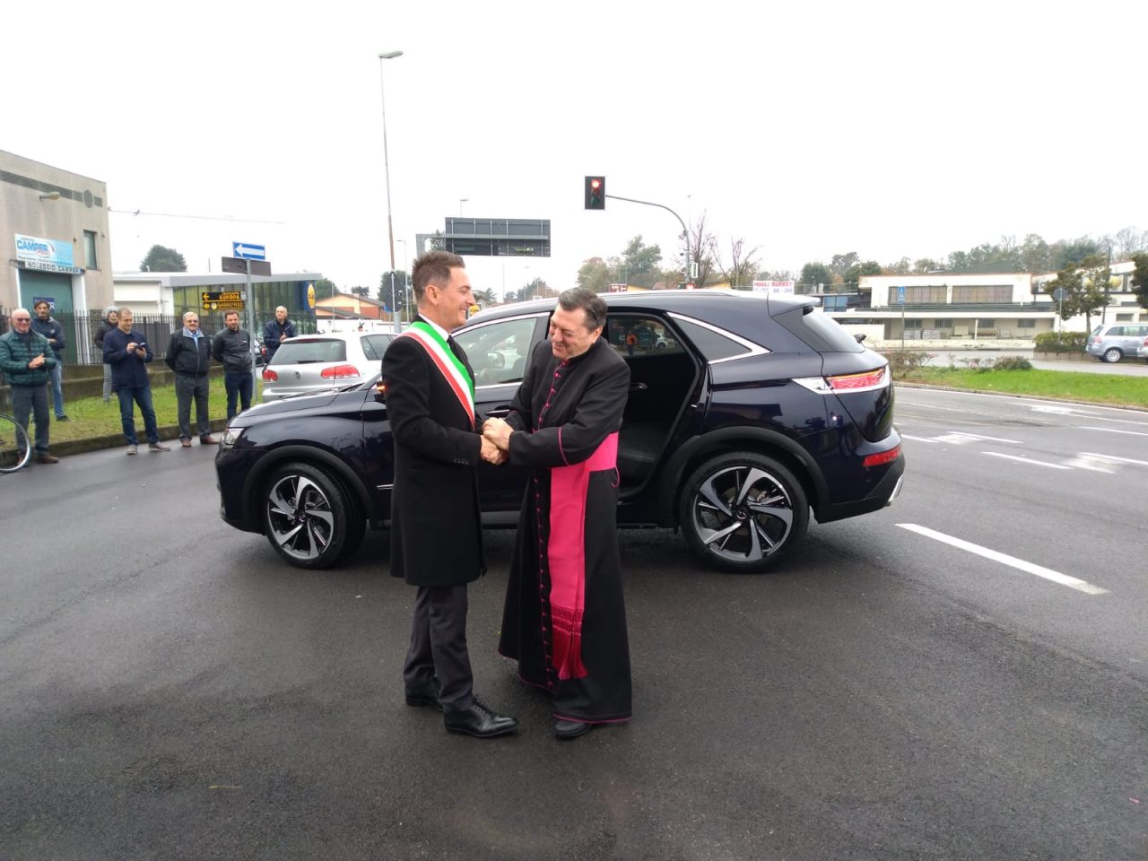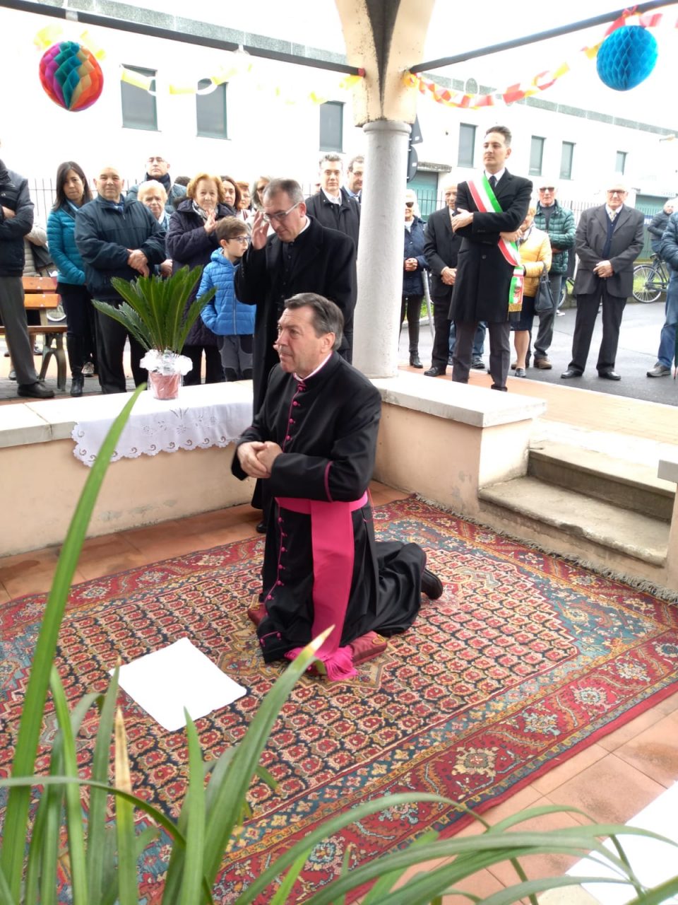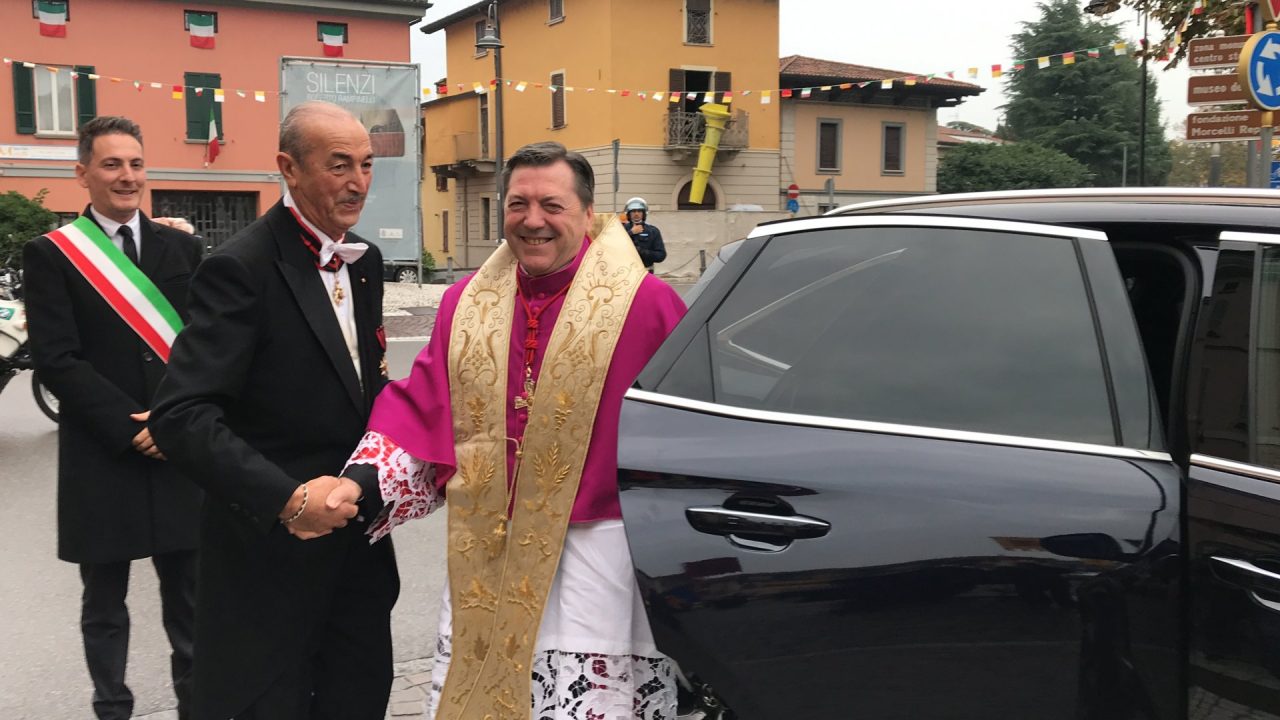 Ai confini della città, nei pressi della zona commerciale, monsignor Fattorini è stato accolto dal sindaco Massimo Vizzardi e si è chinato a baciare il suolo clarense nella santella dell’Angelo Custode in via Brescia.