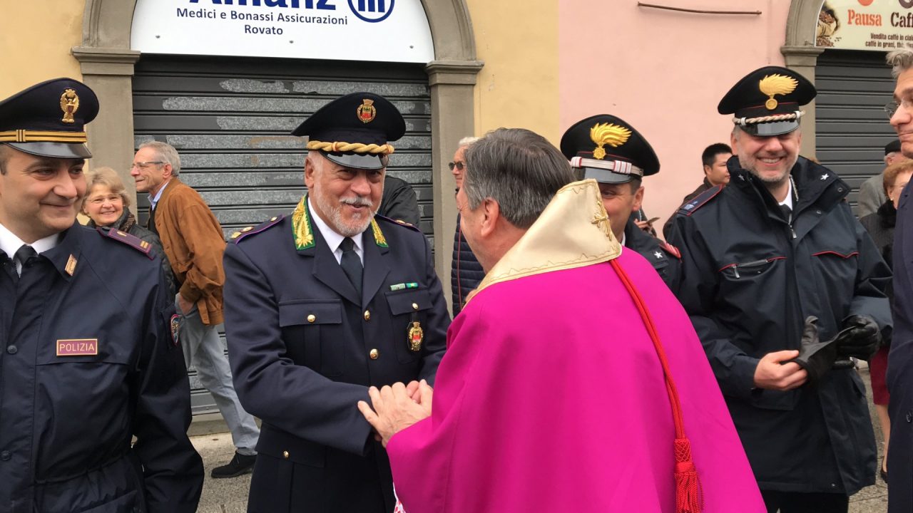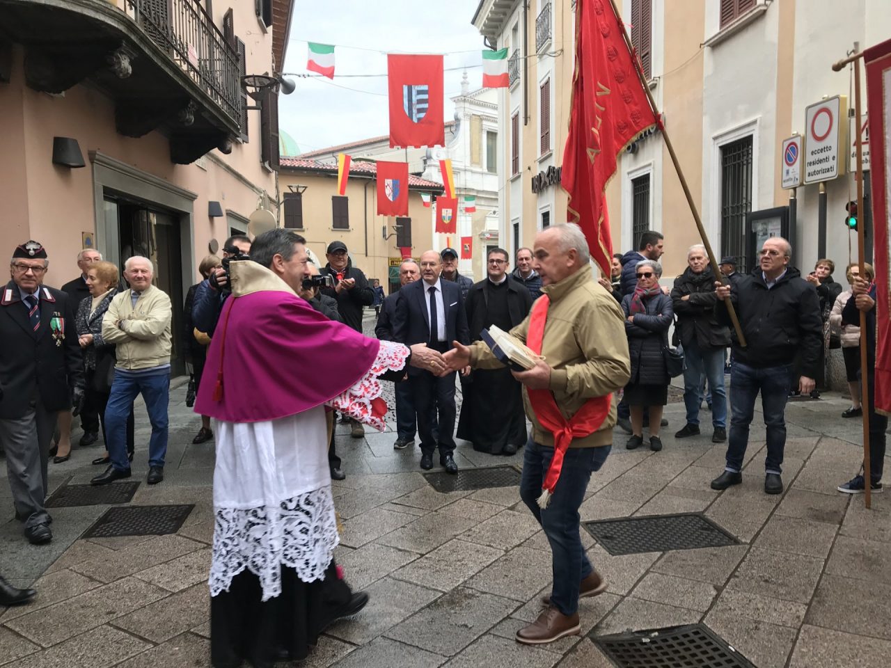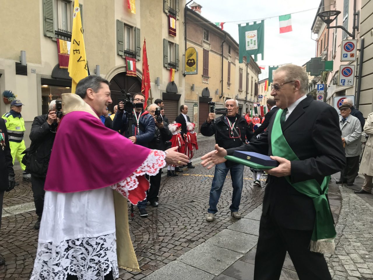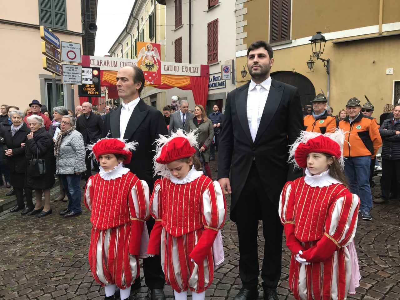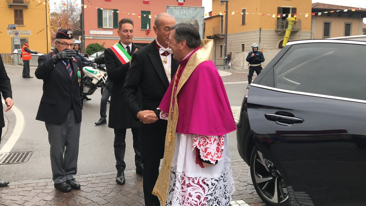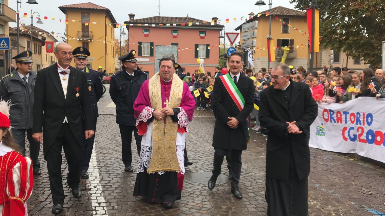 Con corteo d’onore in auto, passando per viale Mazzini meravigliosamente addobbato per l’occasione, monsignor Gian Maria ha raggiunto piazza Martiri. Arrivato davanti alla ex Rocca, il parroco è stato accolto da centinaia di bambini dell’oratorio Centro Giovanile 2000 e di San Bernardino. Poco più avanti ha invece incontrato il vicesindaco Maurizio Libretti, i consiglieri di minoranza Roberto Campodonico e Fabiano Navoni, i rappresentati della Guardia di Finanza e della Polizia di Stato, dei carabinieri, ovvero il maggiore Carlo Pessini e comandante Davide D’Aquila, quello della Polizia Locale Michele Garofalo, i presidenti delle quattro Quadre e tutti i rappresentati delle associazioni, davanti Vigili del fuoco e Protezione civile (che con gli Alpini si è assicurata che tutti i momenti della manifestazione andassero al meglio).