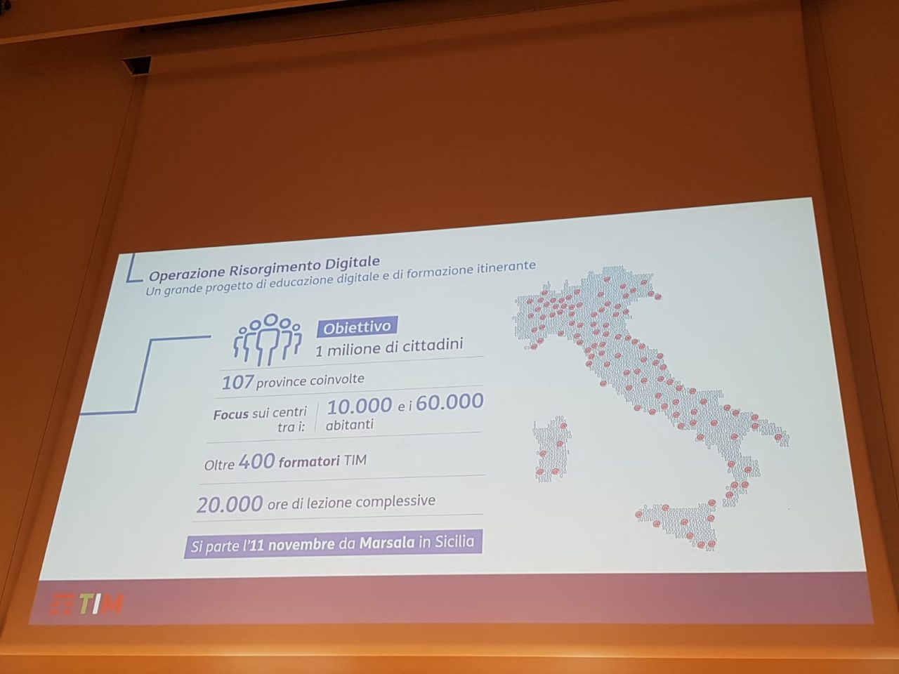 Il programma di formazione guidato dalla Tim Academy fa leva su oltre 400 formatori Tim che offriranno oltre 20mila ore di lezioni entro la fine del 2020, coinvolgendo associazioni, centri di aggregazione ed incontro territoriali, polisportive e centri anziani, con l’obiettivo di diffondere le competenze digitali necessarie per accedere alle grandi opportunità offerte da Internet. Tim darà vita ad un tour itinerante su tutto il territorio nazionale, toccando principalmente comuni con una popolazione compresa tra i 10mila e i 60mila abitanti, dove saranno svolti corsi di formazione digitale di tre settimane. In particolare, una “scuola mobile” sostera’ nelle principali piazze dei comuni coinvolti nell’iniziativa, informando e coinvolgendo i cittadini e le imprese locali attraverso specifiche azioni formative. Si parte l’11 novembre da Marsala, comune simbolo del Risorgimento d’Italia, per toccare nelle settimane successive tutte le province della Sicilia e attraversare progressivamente le altre regioni. L’iniziativa aderisce al Manifesto della Repubblica Digitale promosso dal Commissario straordinario per l’attuazione dell’Agenda Digitale, ha il patrocinio della Rappresentanza in Italia della Commissione Europea, dell’Anci ed e’ aperta al contributo di altre aziende, istituzioni e operatori pubblici e privati. Il progetto si inserisce in un contesto che vede l’Italia ancora indietro nelle classifiche europee per l’utilizzo dei servizi digitali: circa 18 milioni di cittadini, il 30% di quelli con piu’ di 6 anni, non hanno usato Internet nell’ultimo anno; una famiglia su quattro non possiede una connessione a Internet (di queste il 58% dichiara che non e’ connesso perche’ non lo sa usare, mentre il 21% non usa Internet perche’ non lo reputa uno strumento interessante).