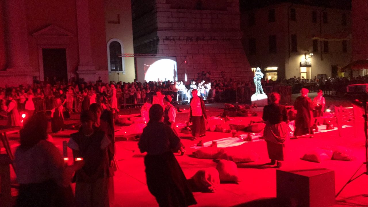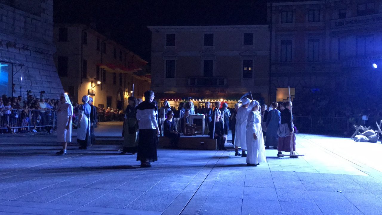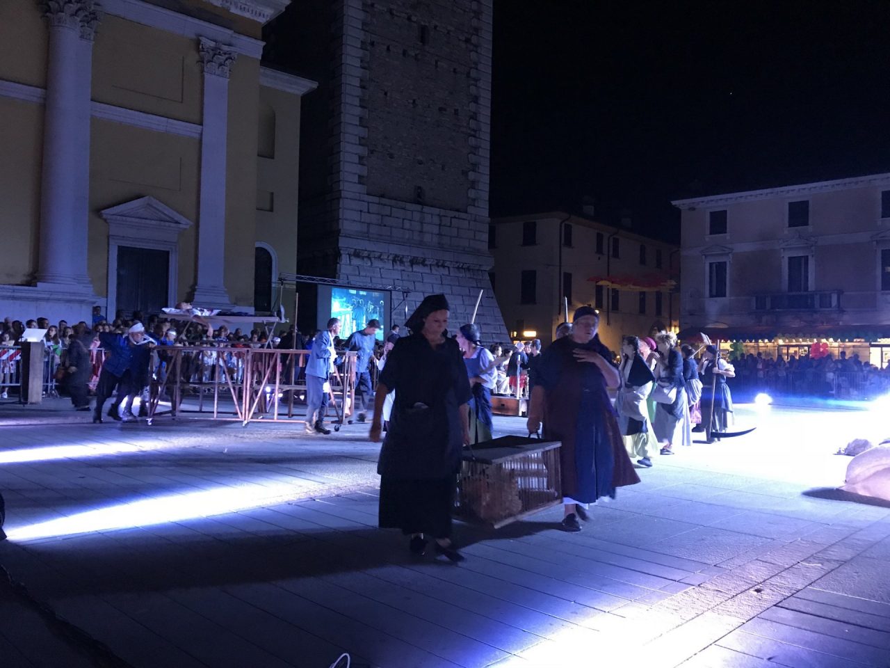 Prima dell’arrivo in piazza non è mancata la sfilata tra le vie del centro. Attori e figuranti hanno percorso la città. Il Corpo bandistico Pedersoli ha dato il via alla serata in piazza.