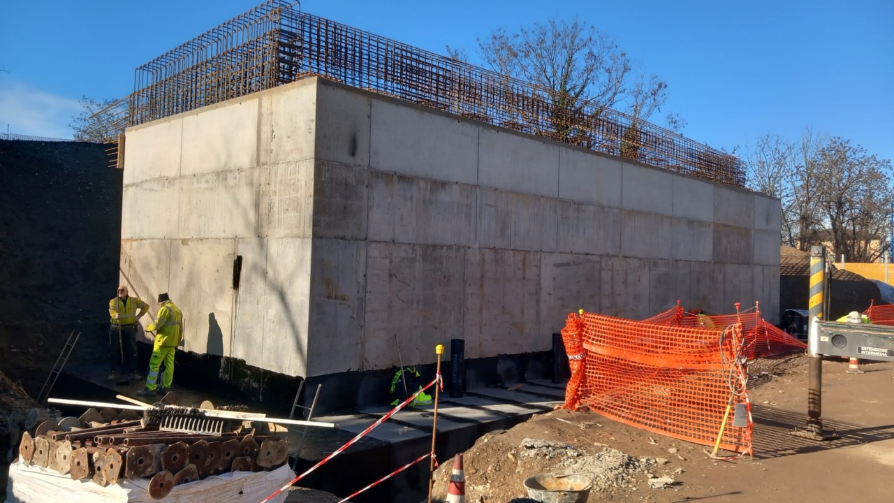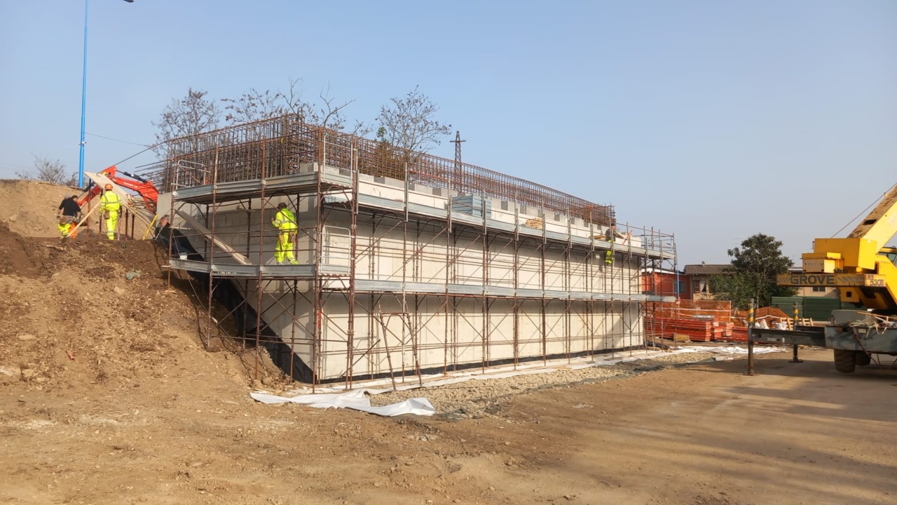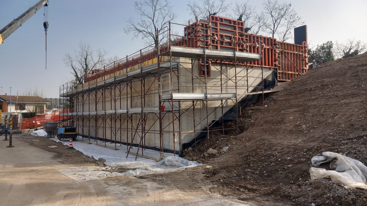 Nei mesi scorsi si è provveduto a demolire la struttura del vecchio ponte e a realizzare pali di fondazione di medio diametro, le parti strutturali interrare a contatto con il terreno sono state impermeabilizzate con guaine protette da membrane bugnate.