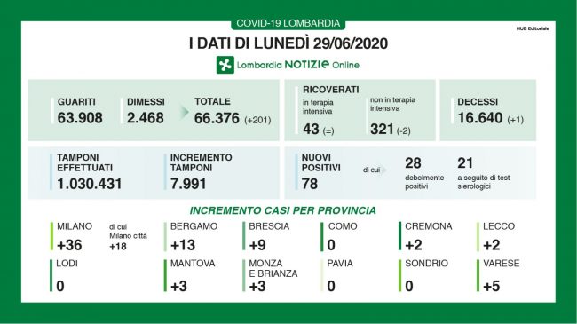 - I nuovi casi positivi: 78 (di cui 21 a seguito di test sierologici e 28 debolmente positivi) per un totale di 94.683
