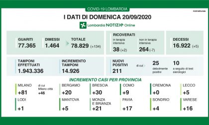 Coronavirus: 30 nuovi contagiati nel Bresciano, 211 in Lombardia. Sono in leggero calo i dati di oggi, domenica 20 settembre, sul fronte Coronavirus. Nel Bresciano si segnalano 30 positivi contro i 37 di ieri (venerdì erano stati 22 , giovedì 32, mercoledì 14, martedì 16, lunedì 17 e domenica scorsa 27 ). In Lombardia i nuovi contagiati sono 211 contro i 243 di ieri (venerdì erano stati 224, giovedì 281, mercoledì 159, martedì 176, lunedì 125 e domenica scorsa 265). Cinque le vittime, contro le 9 di ieri, in aumento le terapie intensive (+2), in calo i tamponi (14.926 contro i 21.721 di ieri, il 18% dei quali in Lombardia).