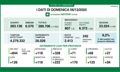 Il report di Regione Lombardia segnala oggi 328 nuovi contagiati a Brescia e provincia contro i 284 di sabato (venerdì 442, giovedì 269, mercoledì 303, martedì 159, lunedì 122 e domenica scorsa 332). Per quanto riguarda la Lombardia ci sono 2.413 nuovi contagiati contro i 3.148 di sabato (venerdì 4.533, giovedì 3.751, mercoledì 3.425, martedì 4.048, lunedì 1.929 e domenica scorsa 3.203).