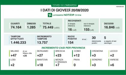 Il Coronavirus torna a far paura. Sono 154 i nuovi contagiati in Lombardia (+63 rispetto a ieri), 23 a Brescia e provincia (ieri erano stati 19). Non va meglio a livello nazionale, con 845 casi (159 in Veneto, 115 nel Lazio, 59 in Toscana, 52 in Emilia Romagna e in Piemonte e nessuna regione a zero contagi).