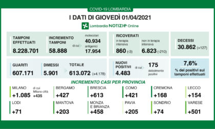 Bergamo: 427; Brescia 613 (dall’inizio della pandemia sono 93.429); Como: 421; Cremona: 178; Lecco: 154; Lodi: 71; Mantova: 203; Milano: 1.085; Monza e Brianza: 458; Pavia: 205; Sondrio: 74; Varese: 501.