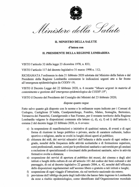 In seguito all’ordinanza emanata dal Ministero della Salute d’intesa con il Presidente della Regione Lombardia, valida sino a domenica 1° marzo compreso, che prevede specifiche disposizioni circa la chiusura di strutture, la sospensione di attività e ulteriori specifici obblighi e dopo la riunione in ATS dei Sindaci e dei Presidenti di Distretto in videoconferenza con Regione Lombardia per avere dettagli sullo stato della situazione, a Montichiari è stata disposta la chiusura di tutti gli istituti scolastici di ogni ordine e grado fino al 1° marzo.