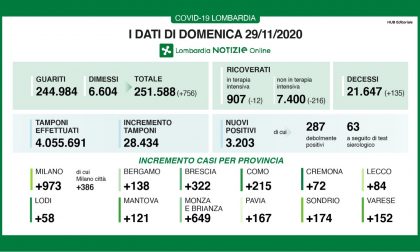 Coronavirus: 322 nuovi contagiati nel Bresciano, 3.203 in Lombardia e 20.648 in Italia. Sono i dati di oggi, domenica 29 novembre, sul fronte Covid-19. Calano i nuovi contagiati nella nostra zona e soprattutto in Lombardia e a livello nazionale, anche se a fronte di un numero di tamponi inferiore rispetto al giorno precedente (oggi nella nostra regione 28.434 mentre ieri 37.286, in Italia 176.934 tamponi contro i 225.940 di ieri).