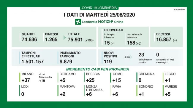 Coronavirus, continua l’altalena del contagio: 25 casi nel Bresciano e 119 in Lombardia. Tornano a salire i contagiati sia a livello di Brescia e provincia (ieri solo sei casi), che a livello regionale (ieri 110 casi), anche se sono aumentati anche i tamponi analizzati (9.879 contro i 7.722 di ieri).