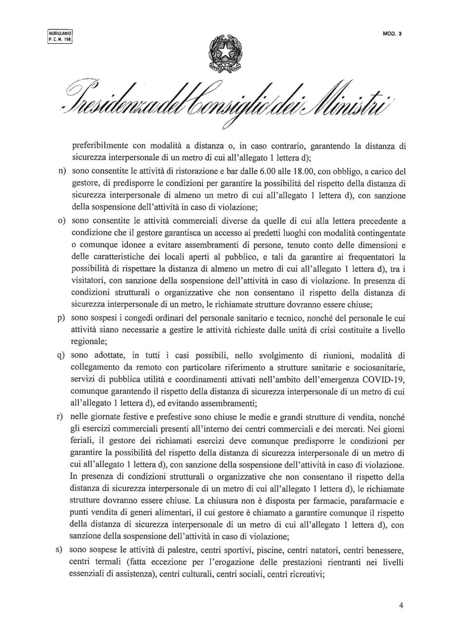 r) nelle giornate festive e prefestive sono chiuse le medie e grandi strutture di vendita, nonché gli esercizi commerciali presenti all’interno dei centri commerciali e dei mercati. Nei giorni feriali, il gestore dei richiamati esercizi deve comunque predisporre le condizioni per garantire la possibilità del rispetto della distanza di sicurezza interpersonale di un metro di cui all’allegato 1 lettera d), con sanzione della sospensione dell’attività in caso di violazione. In presenza di condizioni strutturali o organizzative che non consentano il rispetto della distanza di sicurezza interpersonale di un metro di cui all’allegato 1 lettera d), le richiamate strutture dovranno essere chiuse. La chiusura non è disposta per farmacie, parafarmacie e punti vendita di generi alimentari, il cui gestore è chiamato a garantire comunque il rispetto della distanza di sicurezza interpersonale di un metro di cui all’allegato 1 lettera d), con sanzione della sospensione dell’attività in caso di violazione;