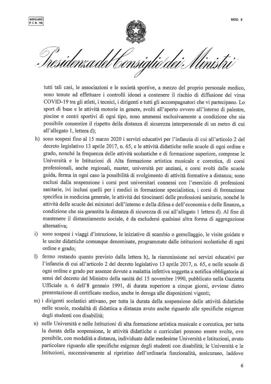 h) sono sospesi fino al 15 marzo 2020 i servizi educativi per l’infanzia di cui all’articolo 2 del decreto legislativo 13 aprile 2017, n. 65, e le attività didattiche nelle scuole di ogni ordine e grado, nonché la frequenza delle attività scolastiche e di formazione superiore, comprese le Università e le Istituzioni di Alta formazione artistica musicale e coreutica, di corsi professionali, anche regionali, master, università per anziani, e corsi svolti dalle scuole guida, ferma in ogni caso la possibilità di svolgimento di attività formative a distanza; sono esclusi dalla sospensione i corsi post universitari connessi con l’esercizio di professioni sanitarie, ivi inclusi quelli per i medici in formazione specialistica, i corsi di formazione specifica in medicina generale, le attività dei tirocinanti delle professioni sanitarie, nonché le attività delle scuole dei ministeri dell’interno e della difesa e dell’economia e delle finanze, a condizione che sia garantita la distanza di sicurezza di cui all’allegato 1 lettera d). Al fine di mantenere il distanziamento sociale, è da escludersi qualsiasi altra forma di aggregazione alternativa;