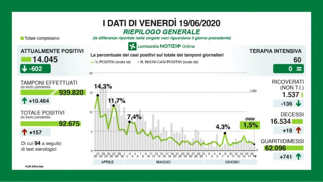 “Dei 157 casi positivi riscontrati venerdì, 94 sono determinati da tamponi eseguiti a seguito della positività allo screening sierologico. Si tratta quindi di persone con sintomatologia pregressa, il cui esito del tampone è risultato debolmente positivo. 8 casi invece sono riferiti a ospiti delle Rsa e 4 a operatori socio sanitari. Stabili le presenze nei reparti di terapia intensiva (60 pazienti), mentre continua a calare il numero dei ricoveri (1.537, 136 meno di ieri)”. Così l’assessore regionale al Welfare Giulio Gallera ha commentato i dati relativi al Coronavirus di oggi venerdì 19 giugno.