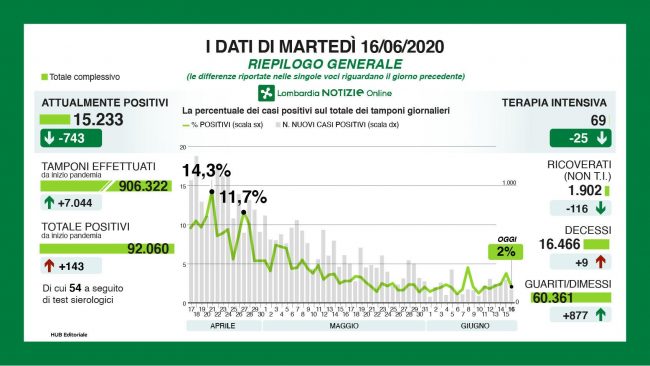 I tamponi effettuati: 7.044, totale complessivo: 906.322. Attualmente positivi: 15.233 (-743), totale complessivo dei positivi riscontrati in Lombardia dall’inizio della pandemia a oggi: 92.060. I nuovi casi positivi: 143 (di cui 54 a seguito di test sierologici), la percentuale fra test effettuati e casi positivi è pari al 2%. I guariti/dimessi: 877, totale 60.361. In terapia intensiva: 69 (-25), i ricoverati non in terapia intensiva: 1902 (-116). I decessi: 9, totale complessivo: 16.466