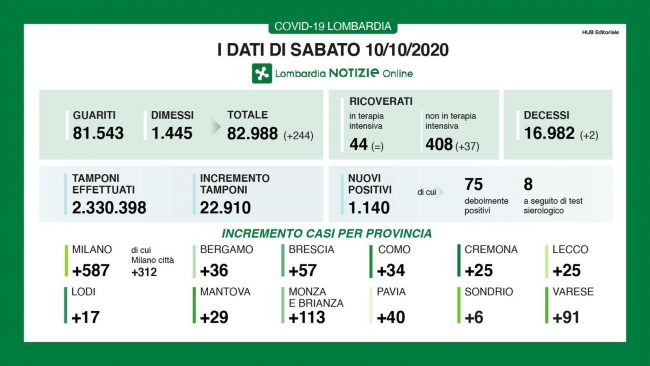 Continuano a crescere i numeri sul fronte Coronavirus, sia nel bresciano che a livello regionale e nazionale. Il report di Regione Lombardia di oggi, sabato 10 ottobre, segnala 57 nuovi positivi nel Bresciano contro i 45 di ieri (giovedì erano 60, mercoledì 52, martedì 19, lunedì 3, domenica 28, sabato 33 e venerdì scorso 20). Niente buone notizie nemmeno sul fronte lombardo, dove il dato complessivo conta 1.140 nuovi contagiati rispetto ai 983 di ieri (giovedì erano 683, mercoledì 520, martedì 350, lunedì 251, domenica 314, sabato 393 e venerdì scorso 307). Impennata di casi in provincia di Milano con ben 587 positivi, rimane la Regione più colpita.