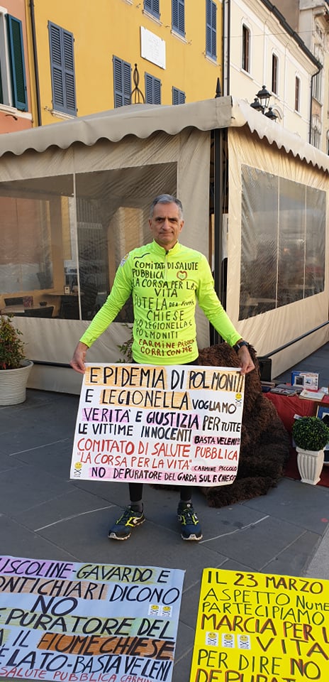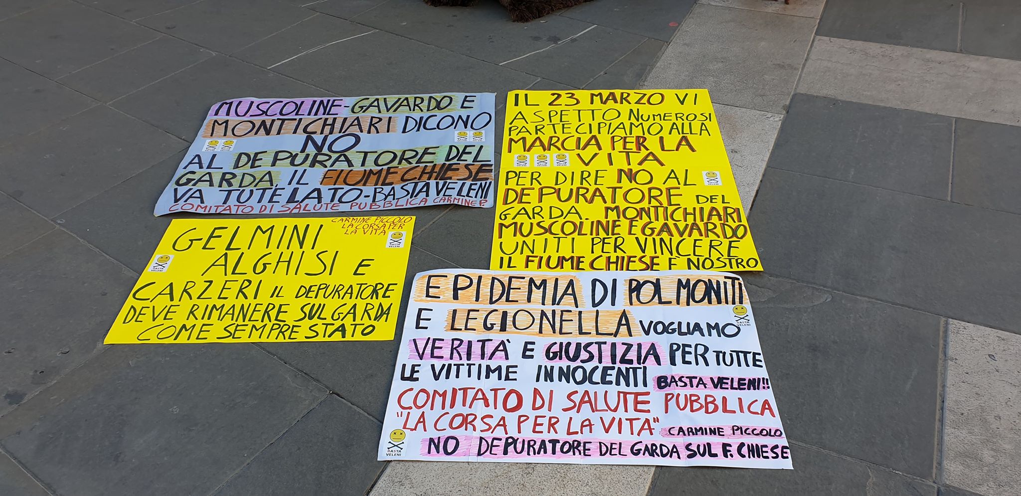 «Questa mattina sono qui a sorpresa» ha esordito davanti alle persone che si fermavano incuriosite ad ascoltarlo «per dire no al depuratore del Garda, per dire che bisogna tutelare il fiume Chiese già ampiamente inquinato. Non esiste un deflusso ecologico funzionale sicuro soprattutto per un fiume che presenta periodi di secca. Chiedetevi perchè sul Garda non vogliono il depuratore. L’acqua è veramente depurata? Noi non possiamo ulteriormente inquinare il fiume che, com’è ormai noto, è stato il veicolo dal quale è partita la polmonite per legionella lo scorso agosto. Le epidemie possono ritornare anche in modo più virulento, trasmesse dalle torri di raffreddamento delle aziende che prelevano l’acqua dal Chiese. La mia protesta parte oggi da qui ma toccherà anche Muscoline e Gavardo in modo tale da creare un grande movimento che faccia fronte comune contro il nuovo scempio che si vuole realizzare».