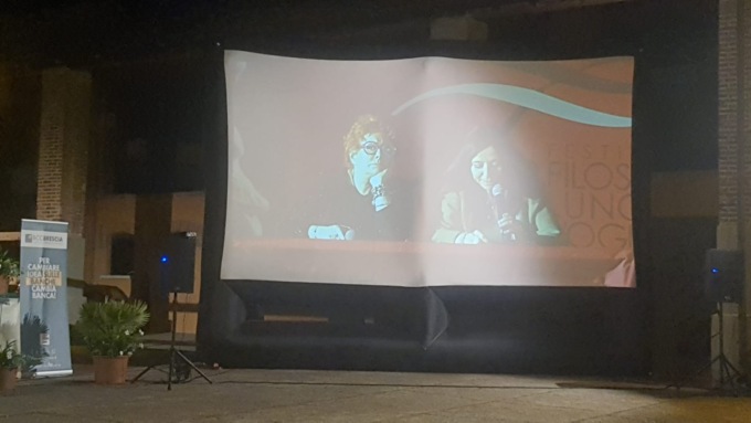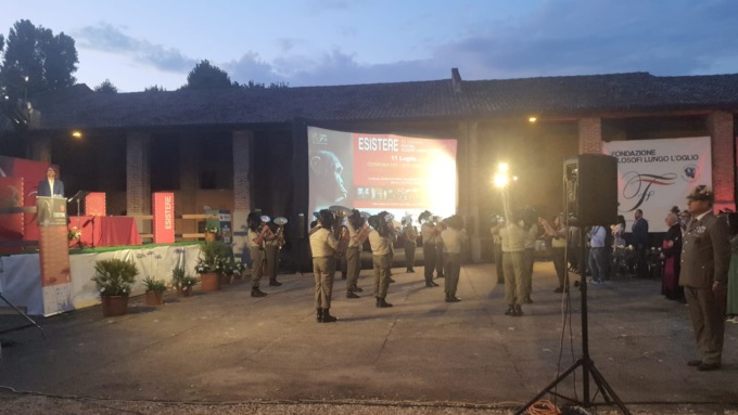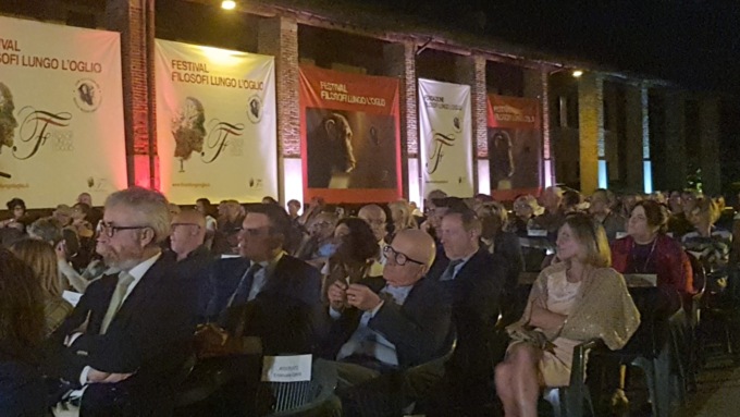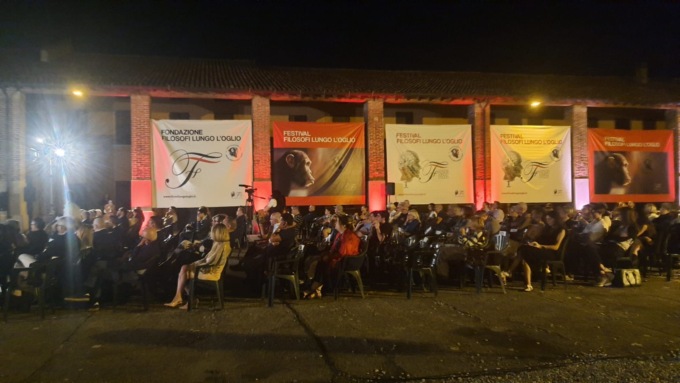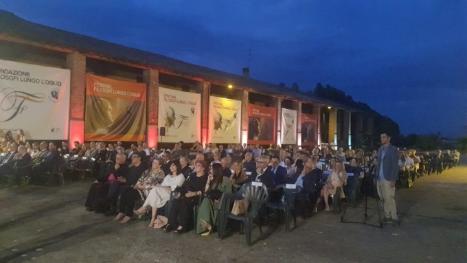 La serata si è aperta con l’esibizione della Fanfara dell’Esercito Italiano alla quale sono seguiti numerosi interventi delle autorità presenti il Generale Carmine Sepe, Comandante dell’Esercito della Lombardia, il Prefetto di Brescia, S. E., Andrea Polichetti, il già Prefetto di Brescia e Direttore dell’Ufficio per il Coordinamento e la Pianificazione delle Forze di polizia, Dott. Annunziato Vardé, il Sen. Gianpietro Maffoni, il Vice-presidente del Consiglio Regionale, Emilio Del Bono, Mons. Gaetano Fontana, Vicario generale, delegato del Vescovo di Brescia, S. E., Mons. Pierantonio Tremolada. Dalla platea numerosi sindaci, assessori e autorità, unitamente ad un folto pubblico hanno ascoltato gli interventi che vertevano sull’importanza di fare cultura, oggi più che mai, anche in modi non canonici, come può essere un festival itinerante, ma densi di significato e significati, del resto in questi 20 anni il pubblico ha dato ragione all’idea che la professoressa Francesca Nodari, filosofa levinasiana e Presidente della Fondazione Filosofi lungo l’Oglio, ha portato avanti con tenacia e passione dimostrando quanto ci sia bisogno di rassegne come questa. La stessa Nodari in dialogo con Maria Rita Parsi, nota psicoterapeuta e scrittrice di fama internazionale, nonché madrina del Festival Filosofi lungo l’Oglio ha presentato il documentario “Quando la filosofia diventa contagiosa. Dal sogno alla realtà”, che ripercorrerà i primi vent’anni di vita del Festival, restituendone il significato più profondo, la crescita, l’impatto sul territorio e il valore culturale costruito nel tempo.
