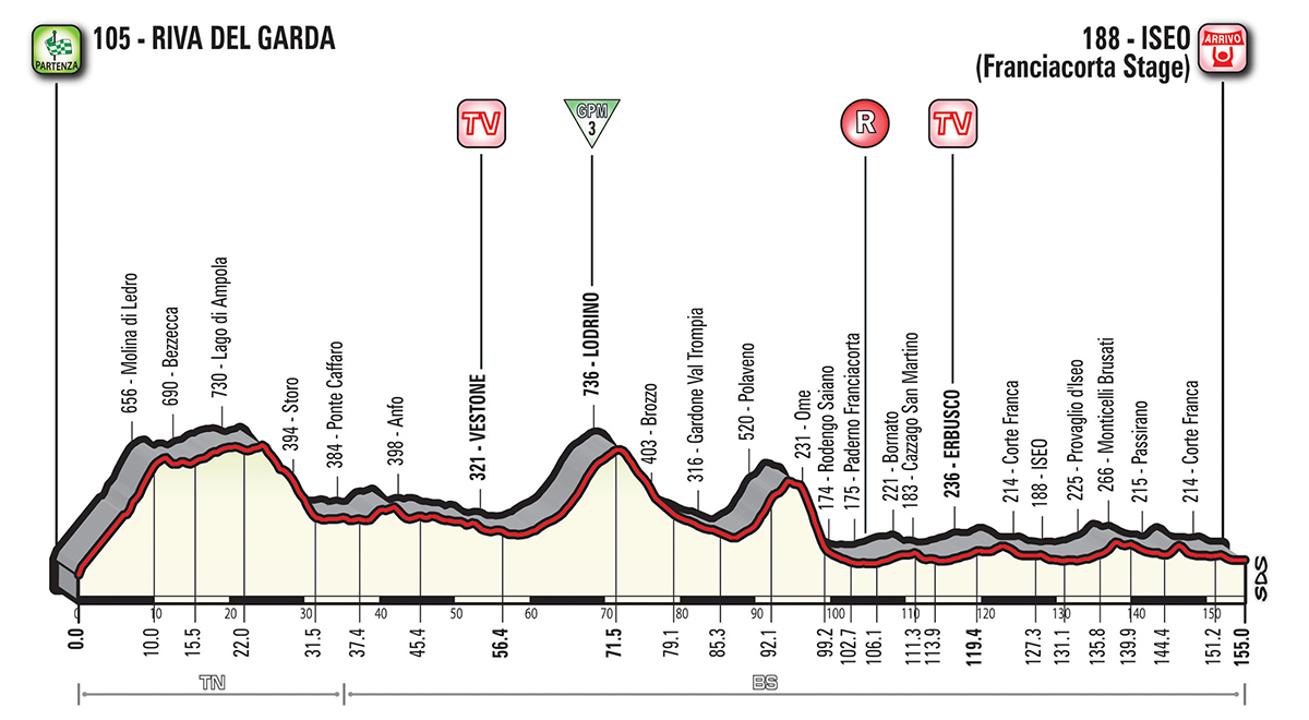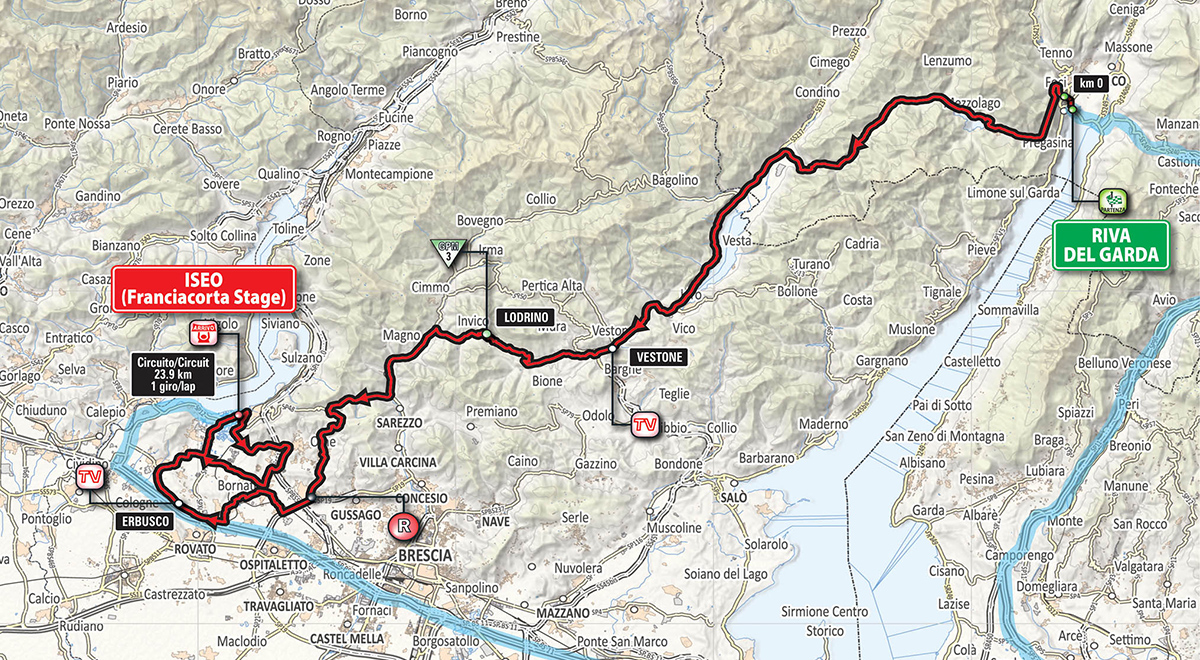 “Si parte in salita con due lunghe gallerie che portano a Molina di Ledro e Bezzecca per scendere verso il Bresciano dove si supera il GPM di Lodrino, Segue una discesa impegnativa dopo Polaveno che porta alla zona del Franciacorta. Vengono attraversati alcuni piccoli centri abitati con molte curve secche e alcuni passaggi a livello fino a un primo passaggio sulla linea del traguardo di Iseo per affrontare il circuito finale di 23.9 km. Ultimi km: circuito molto impegnativo su strade mediamente di carreggiata ristretta con fondo buono e molto spesso all’interno di piccoli borghi. A 6 km dall’arrivo ultimo passaggio a livello. Ultimi 5 km abbastanza impegnativi con diverse rotatorie fino all’ultima di ampio raggio a circa 500 m dall’arrivo. Rettilineo di arrivo di 300 m in asfalto largo 7 m”.
