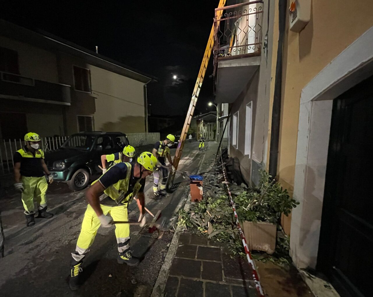 Sul posto è intervenuta prontamente la polizia locale che ha chiuso immediatamente la strafa al traffico. Una squadra di volontari del Gruppo comunale di protezione civile è stata attivata per lo sgombero dei calcinacci e ha collaborato con i vigili del fuoco per la messa in sicurezza dell’area.
