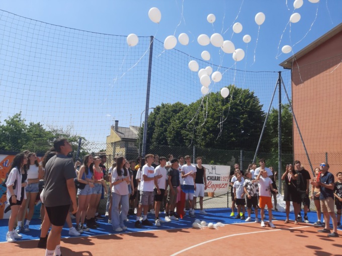 Dopo aver scoperto il murales, a prendere la parola sono stati i compagni di classe che, assieme a tanti palloncini, hanno raggiunto l’amico in cielo.