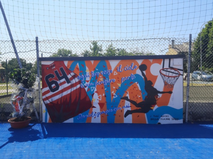 Ciao Daniele, è quasi un anno che non sei più tra noi e ci manchi. Qualche volta ci sorprendiamo a pensarti, a pensare come sarebbe bello se fossi ancora qui. Abbiamo fortemente voluto qualcosa che potesse ricordarti, dedicato a te e che ti rappresenti. Pensiamo che questo murales sia stata la soluzione migliore. Questo è il nostro pensiero per te, il nostro abbraccio che da un campo da basket si alza verso il cielo.