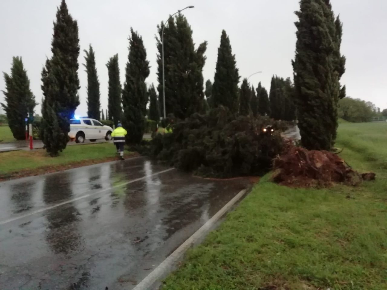 Bloccata la circolazione in via Bonfadina a Cazzago San Martino, dove uno dei cipressi che fiancheggia la strada all’altezza del cimitero è rovinato sulla carreggiata. Nessuno ferito: la Protezione civile è all’opera per liberare la via.