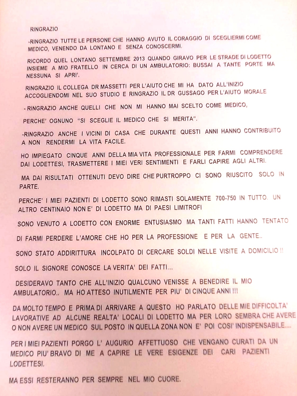 Nella lettera il dottore ha messo in evidenza che “ero venuto a Lodetto con tanto entusiamo, ma tanti fatti hanno tentato di farmi perdere l’amore per la professione e la gente”. E poi, “in cinque anni nessuno è mai venuto a benedermi lo studio”.