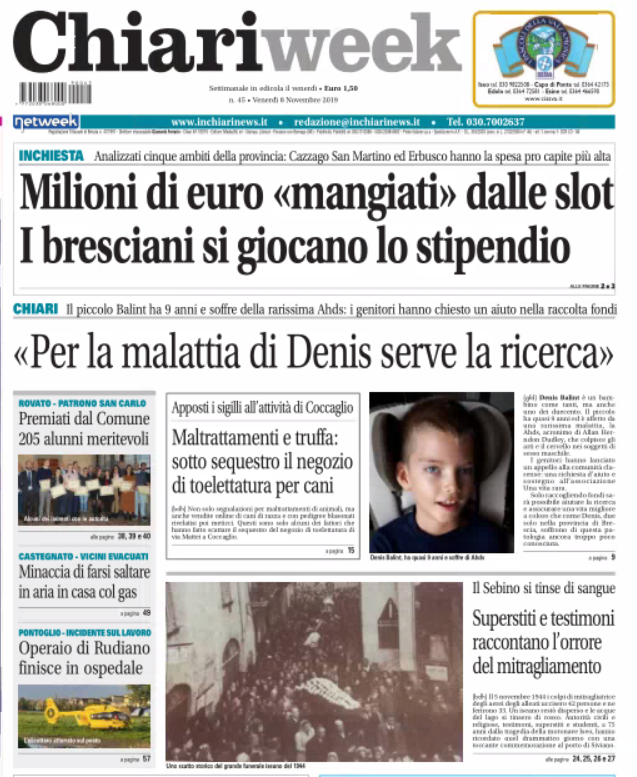 Da non perdere l’inchiesta con Rete AlternAttiva: milioni di euro «mangiati» dalle slot. Un servizio su quanto i bresciani spendono nel gioco d’azzardo e… si giocano lo stipendio. A Chiari invece, i genitori di Denis Balint hanno lanciato un appello. Il piccolo soffre di Ahds, una malattia ultra rara e servono fondi per la ricerca. Di questo si occupa l’associazione Una vita rara.