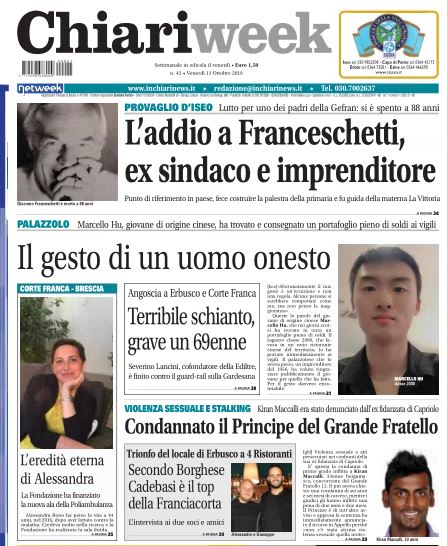 Il nuovo numero del settimanale della Bassa bresciana, della Franciacorta e del Basso Sebino è in edicola con tante nuove notizie. Provaglio ha detto addio a Giacomo Franceschetti: si è spento a 88 anni l’ex sindaco e imprenditore (co-fondatore della Gefran) punto di riferimento in paese e presidente della Fondazione dell’infanzia La Vittoria. A Palazzolo invece, Marcello Hu, giovane di origini cinesi, ha trovato e consegnato un portafoglio pieno di soldi ai vigili.