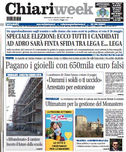Il nuovo numero di Chiariweek è in edicola con un servizio speciale sulle elezioni del 26 maggio, un arresto per estorsione e uno per truffa aggravata.