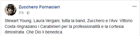 Il grazie ai carabinieri è arrivato da Fornaciari in persona, dalla band, da Laura Vergani, Stewart Young e dal legale Vittorio Costa tramite la pagina Facebook ufficiale del cantautore.