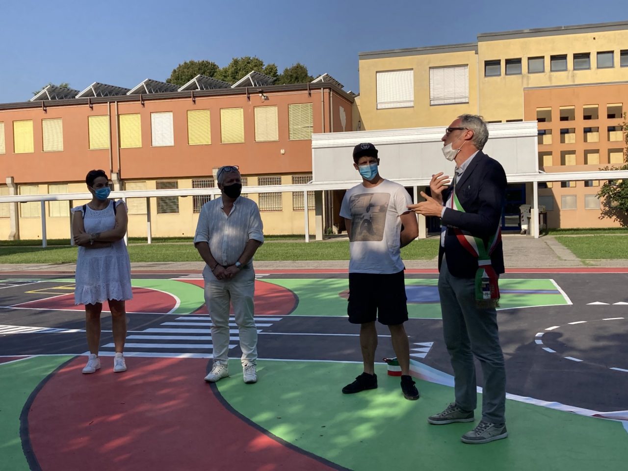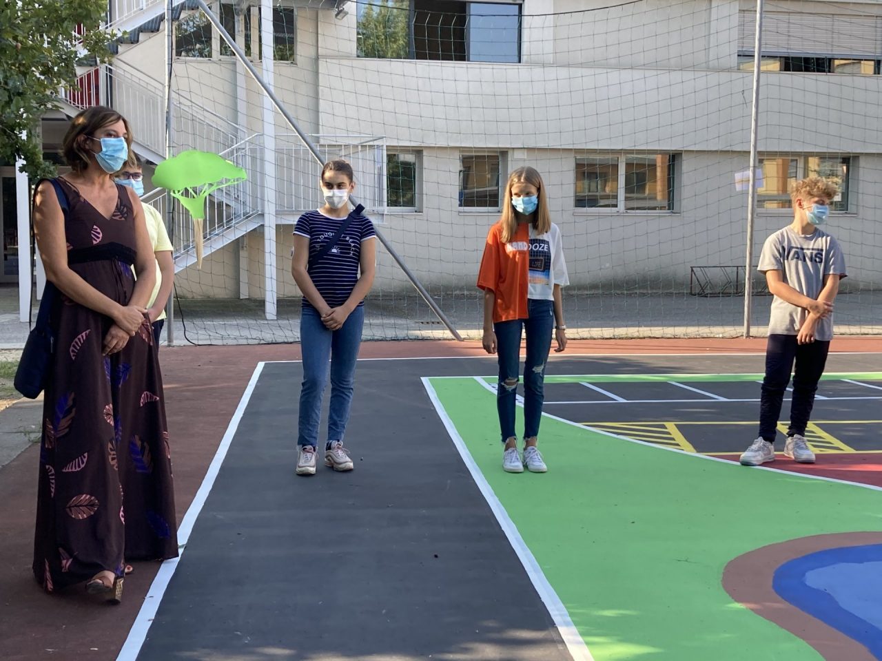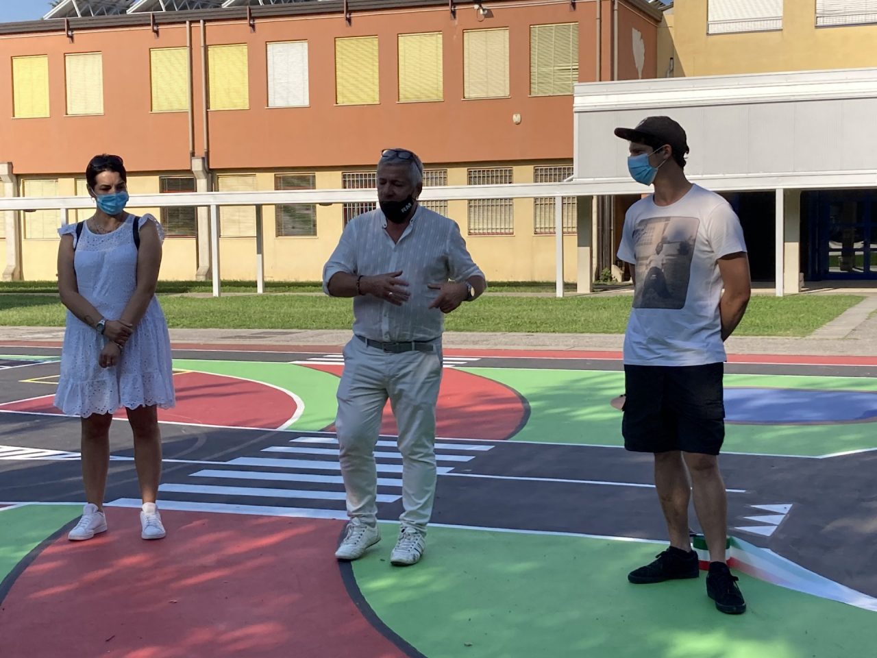 Lo spazio, che ospita anche il campo da basket esterno alla palestra, vede dipinti segnaletiche e percorsi che verranno utilizzati già dalle prossime settimane dagli studenti durante le attività scolastiche.