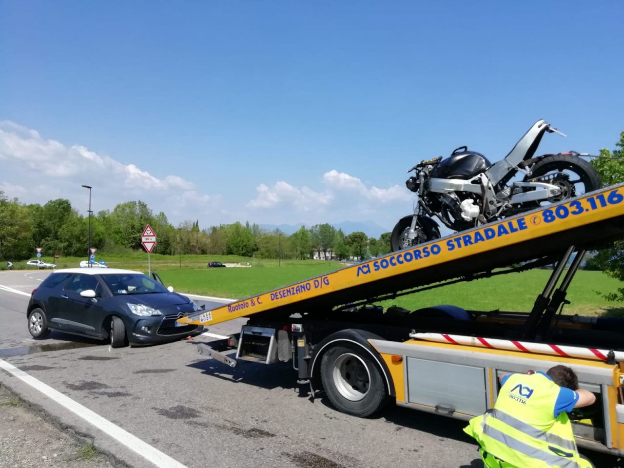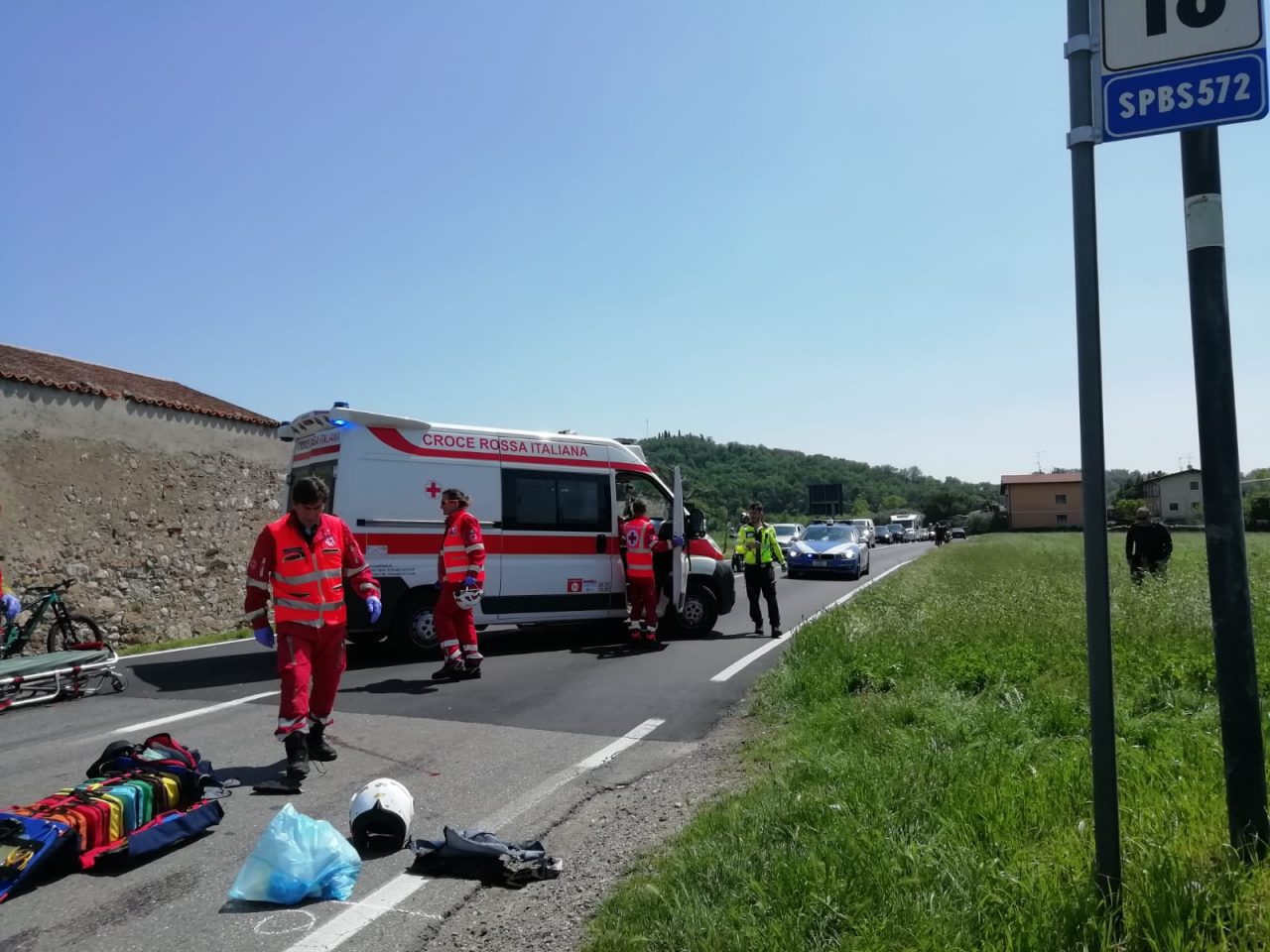 Il motociclista (classe 1963 di Rivoltella) è stato sbalzato per 10 metri. Era cosciente ma ha riportato diverse fratture.