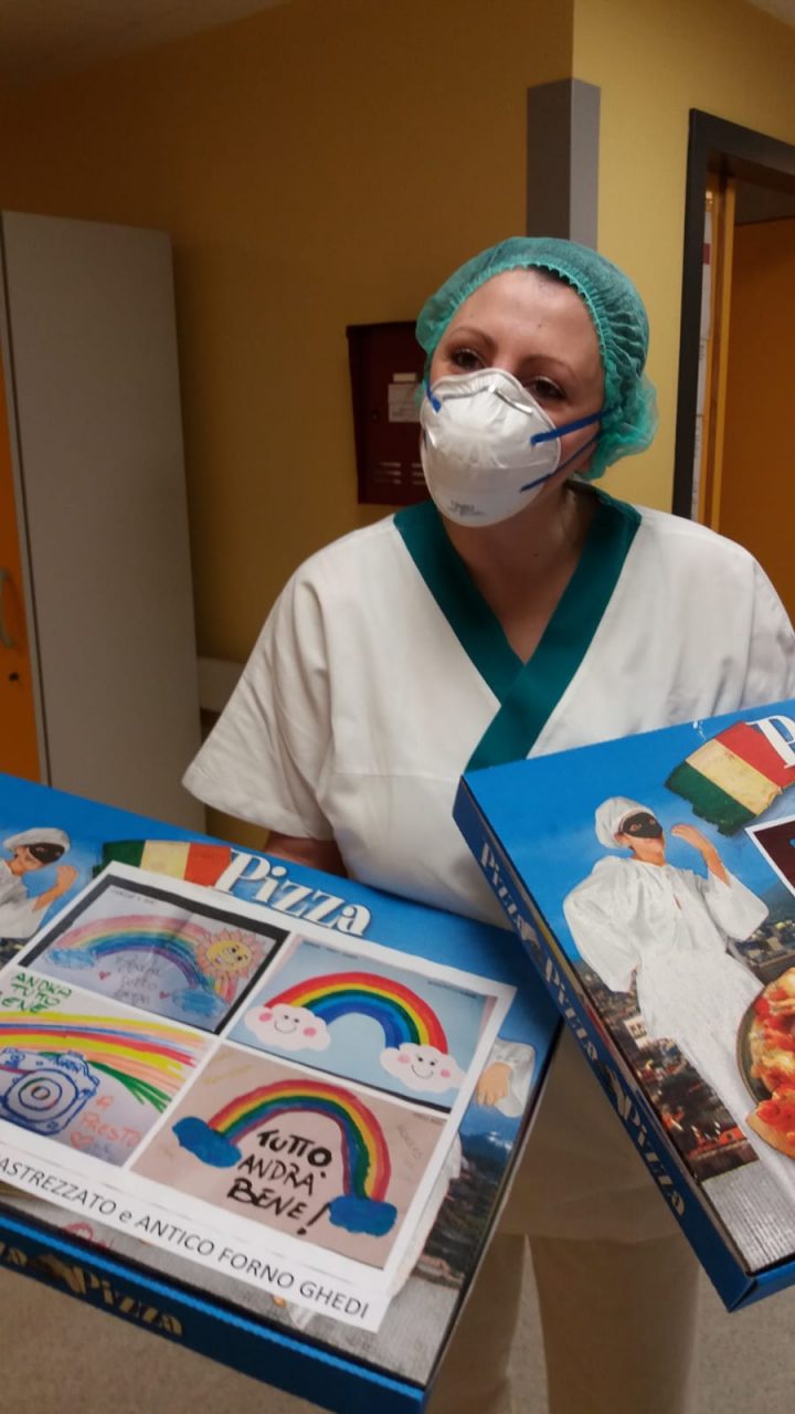Sui cartoni ci sono anche i disegni dei bambini pronti a dare sostegno ai medici e al personale, volti a dire “andrà tutto bene”.