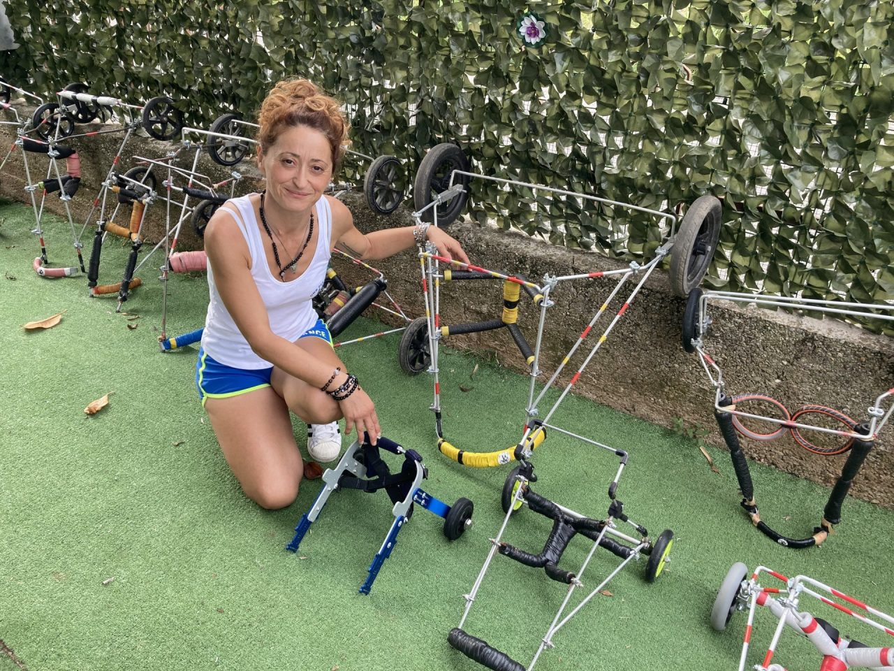 Gina, una delle volontarie, davanti ai carrellini creati e donati gratuitamente agli animali più bisognosi.