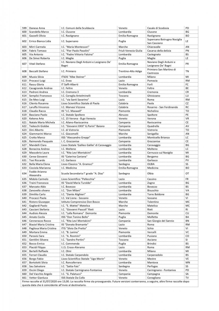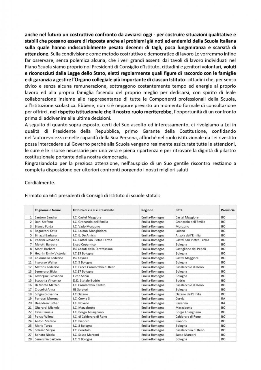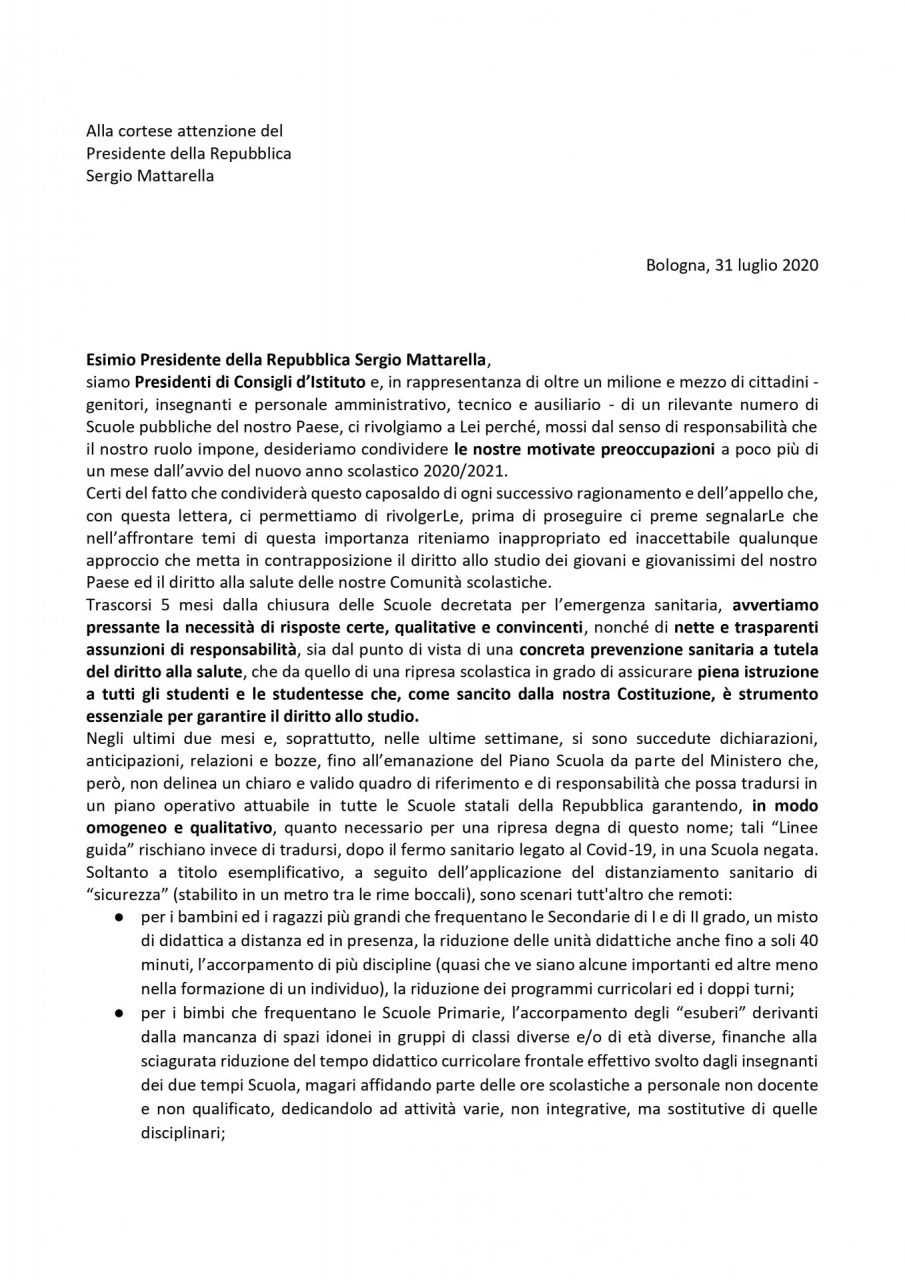 “Si prospetta uno sconcertante declassamento del modello didattico e l’inaccettabile riduzione del tempo dedicato alla didattica curricolare frontale, presentato al Paese come modernizzazione, che comporterebbe l’abbassamento della loro futura preparazione, se non addirittura la riduzione dell’accesso all’istruzione che è dovere ineludibile della nostra Repubblica democratica – hanno poi concluso – A seguito di quanto sopra esposto, certi del Suo ascolto ed interessamento, ci rivolgiamo a Lei in qualità di Presidente della Repubblica, primo garante della Costituzione, confidando nell’autorevolezza e nelle capacità della sua persona, affinché nel ruolo istituzionale da lei rivestito possa intercedere sul Governo – hanno concluso – Questo affinché alla scuola vengano realmente assicurate tutte le attenzioni, le cure e le risorse necessarie per una vera e piena ripartenza e per ritrovare la dignità di pilastro costituzionale portante della nostra democrazia”