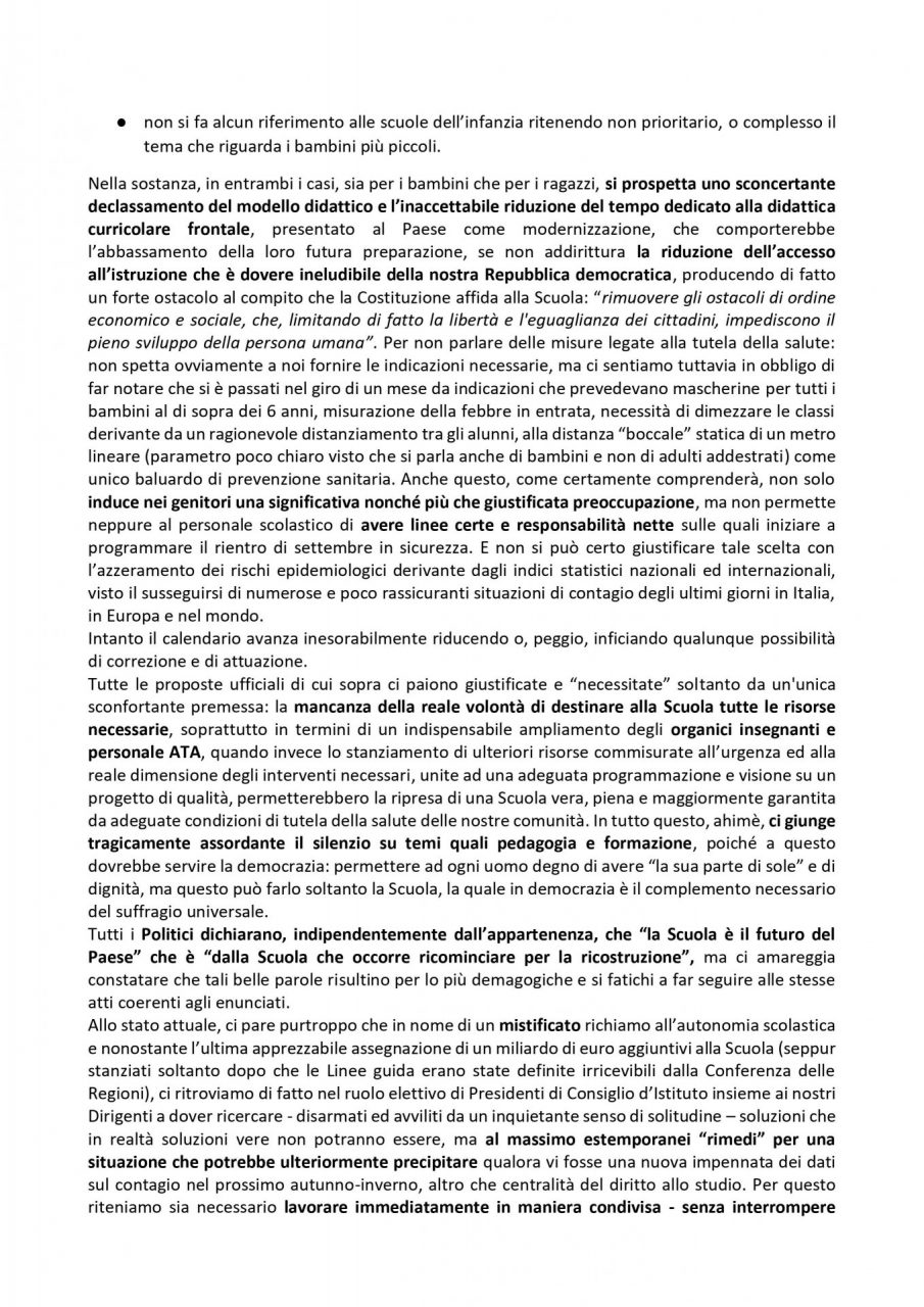 “Negli ultimi due mesi e, soprattutto, nelle ultime settimane, si sono succedute dichiarazioni, anticipazioni, relazioni e bozze, fino all’emanazione del Piano Scuola da parte del Ministero che, però, non delinea un chiaro e valido quadro di riferimento e di responsabilità che possa tradursi in un piano operativo attuabile in tutte le Scuole statali della Repubblica garantendo, in modo omogeneo e qualitativo, quanto necessario per una ripresa degna di questo nome”.