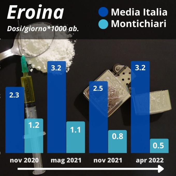 Segna invece una progressiva diminuzione dei consumi, già molto bassi in città, l’eroina. Se nel novembre 2020 si stimava un consumo medio a Montichiari di 1,2 dosi al giorno ogni mille abitanti, progressivamente il dato è calato fino a mezza dose al giorno. Tra le sei e le sette volte meno del consumo nazionale, pari a 3,2 dosi al giorno per mille abitanti.