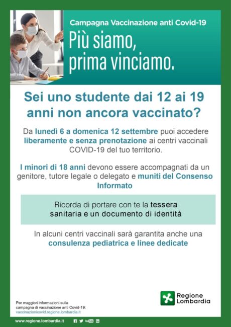 “Proprio mentre siamo a un passo dal raggiungere 14 milioni di somministrazioni, parte lunedì 6 un’altra importante iniziativa che riguarda le vaccinazioni ai giovani. Una proposta pensata per garantire un rientro in sicurezza per l’avvio del nuovo anno scolastico – ha spiegato l’assessore regionale al Welfare Letizia Moratti tramite un post pubblicato sulla sua pagina Facebook – Questa è la locandina dell’iniziativa che prevede, da lunedì 6 a domenica 12 settembre, l’accesso libero e senza prenotazione nei centri vaccinali Covid per i ragazzi della fascia di età 12-19 anni. In alcuni centri, che saranno comunicati dalle Ats, sarà garantita anche una consulenza pediatrica e linee dedicate”.