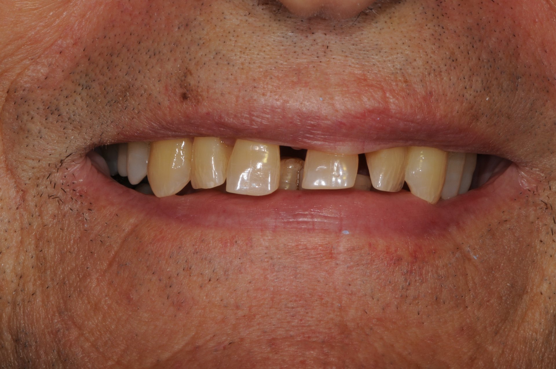 «Paziente maschio di anni 70 soggetto ad una parodontite cronica aggressiva (piorrea). Risulta avere il 100% degli elementi di entrambe le arcate dentarie compromessi da un severo riassorbimento osseo orizzontale. Dopo essere stato sottoposto al protocollo di terapia causale (igienizzazione profonda e settoriale con insegnamento di tecniche di mantenimento di igiene domiciliare) visionato e studiato lo status radiografico, la Tac Cone Beam e i modelli studio, effettuato un’analisi fotografica digitale (Digital Smile Design), confrontato le foto storiche e preoperatorie del paziente e raccolti tutti i dati dento–facciali e funzionali, si pianifica un trattamento che risolva a lungo termine tutte le problematiche».