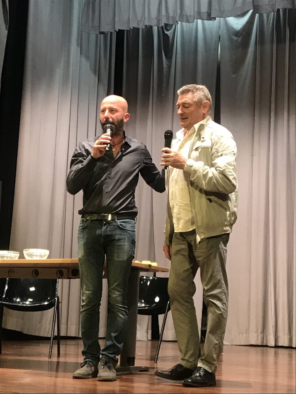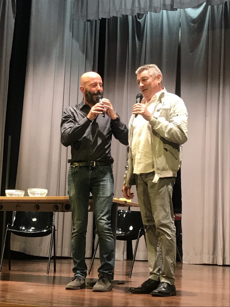 Immancabile il saluto di don Angelo e don Massimo, sul palco con il presentatore e con Massimiliano Torresi.