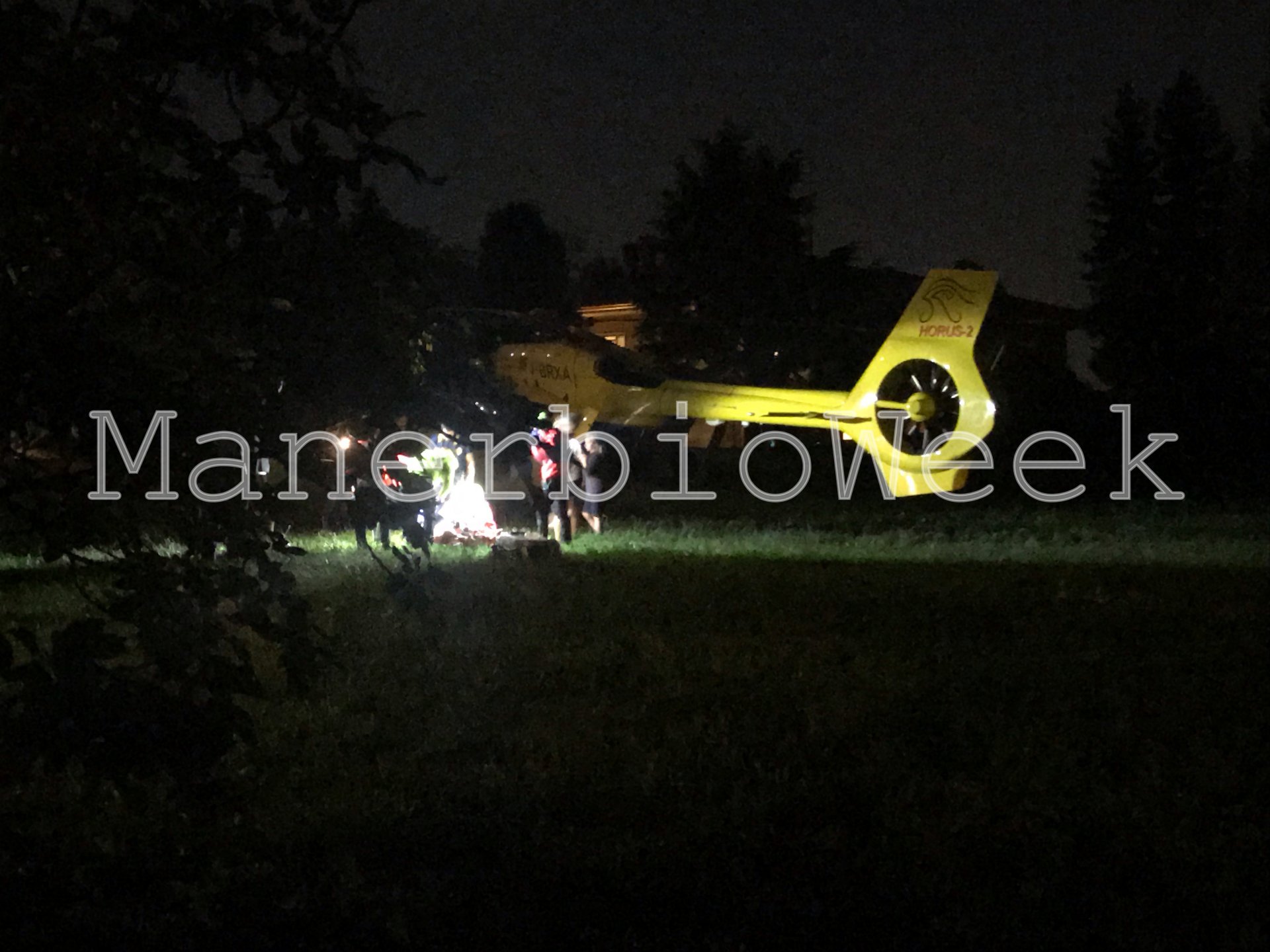 L’elicottero del soccorso sanitario è atterrato in un terreno vicino all’abitazione in cui è accaduto il sinistro effettuando una manovra di fuori campo notturno.