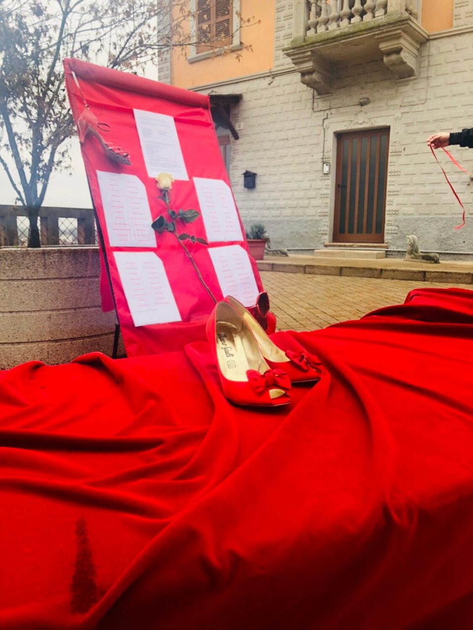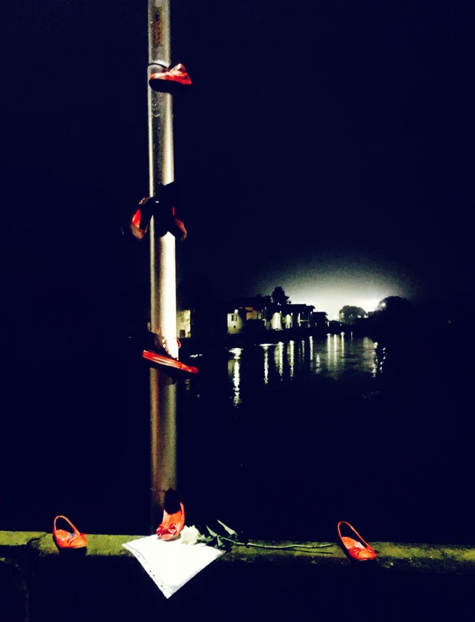 Anche il ponte è stato interessato dalla ricorrenza. Sono infatti apparse delle scarpe rosse anche nei pressi del fiume. L’installazione è stata allestita da Simona Schivardi e Ilenia Tassi del rione rosso.
